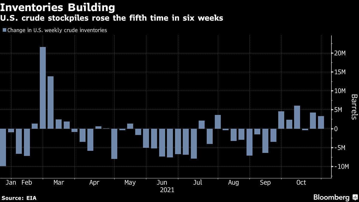 Futures in New York slid near $80 a barrel after losing almost 4% over the past two sessions. OPEC+ is gathering later Thursday and the group is expected to stick to its planned gradual output hike for December, despite calls from consumers to pump more. In the U.S., crude inventories climbed for the fifth time in six weeks, according to Energy Information Administration data.