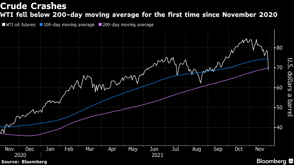 At the end, investors were rushing to cover short positions, analysts were ripping up forecasts and next week’s OPEC+ meeting was up in the air. West Texas Intermediate oil, the U.S. benchmark, closed 13% lower, the biggest decline since April 2020. Brent crude slumped 12%.