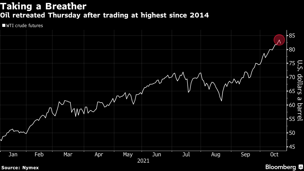 Oil is holding near the highest levels since 2014 with supplies depleting as coal and natural gas shortages drive greater crude consumption. Saudi Arabia said any extra oil from OPEC+ would do little to tame the surging cost of gas, predicting demand may rise as much as 600,000 barrels a day if the northern hemisphere’s winter is colder than normal.