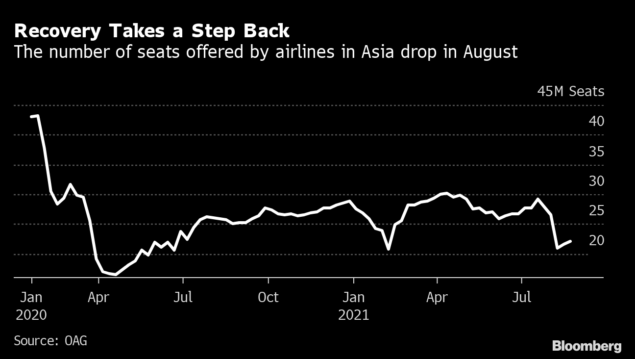 Airlines across 23 Asia-Pacific nations offered 22.2 million seats in the final week of August, according to aviation-intelligence firm OAG. That’s about half the number at the end of January 2020 --- before widespread lockdowns savaged air travel -- and the lowest figure since February this year.