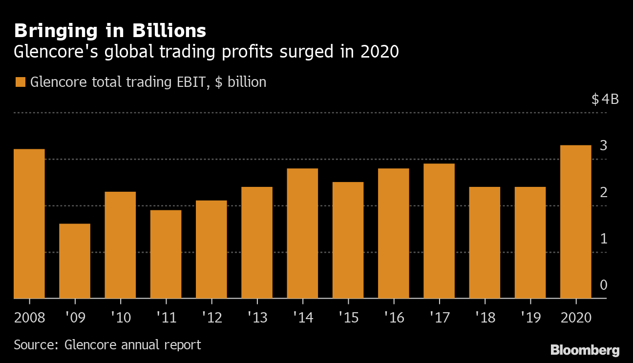 Glencore makes billions of dollars every year buying and selling commodities — above the money it makes digging metals, pumping crude or harvesting crops. In 2020, the company enjoyed its best trading ever, making $3.3 billion in earnings before interest and taxes, up 41% from the previous year despite the impact of Covid-19 on the global economy.