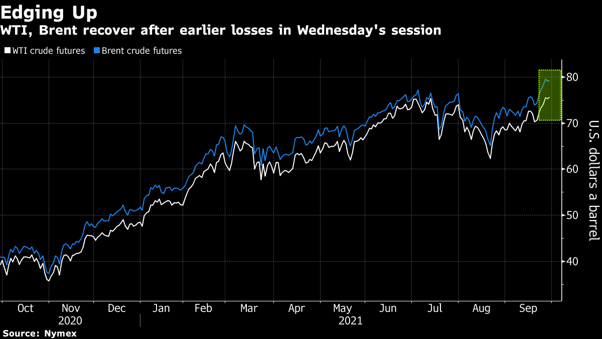 Futures in New York edged up in choppy trading after earlier falling as much as 2.1% on Wednesday. The more-than 4 million-barrel increase in U.S. crude stockpiles failed to keep futures lower amid continued signs of a global energy crunch.