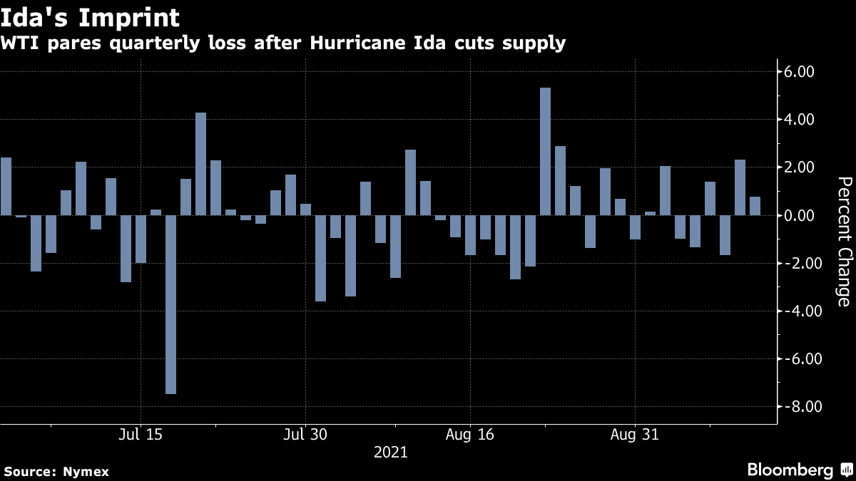 Almost half of crude output in the U.S. Gulf of Mexico -- about 884,000 barrels a day -- had yet to resume after Hurricane Ida as of Sunday, according the latest statement from the Bureau of Safety and Environmental Enforcement. Tropical Storm Nicholas is over the western side of the Gulf and is about to menace Texas. Louisiana declared a state of emergency ahead of the latest storm.