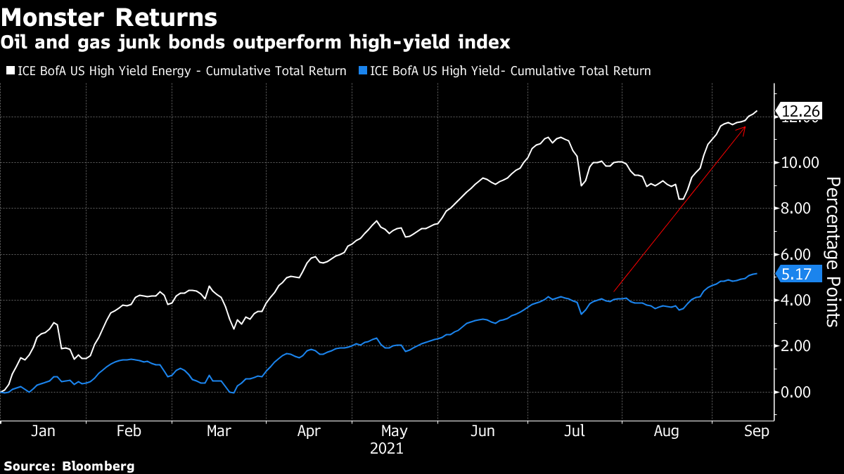 Over the last month, the energy sector has returned around 90 basis points versus 54 basis points for U.S high-yield as a whole, according to ICE BofA US indices. U.S energy bonds have handed investors an 11% return year to date, compared with 4.6% for broader U.S high-yield debt.
