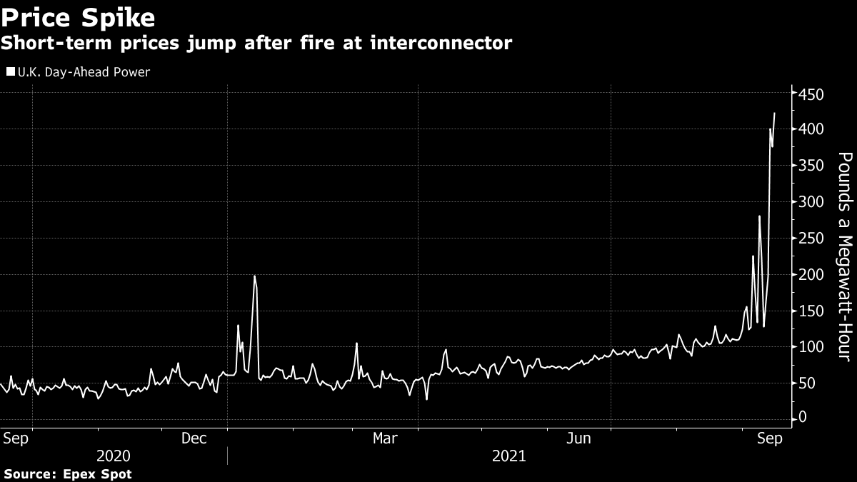 Gas and power prices jumped as the U.K. grid operator said the cable will be out for at least a month. Firefighters have been battling the blaze at a converter station since the middle of the night, and are expected to remain there for some time yet.