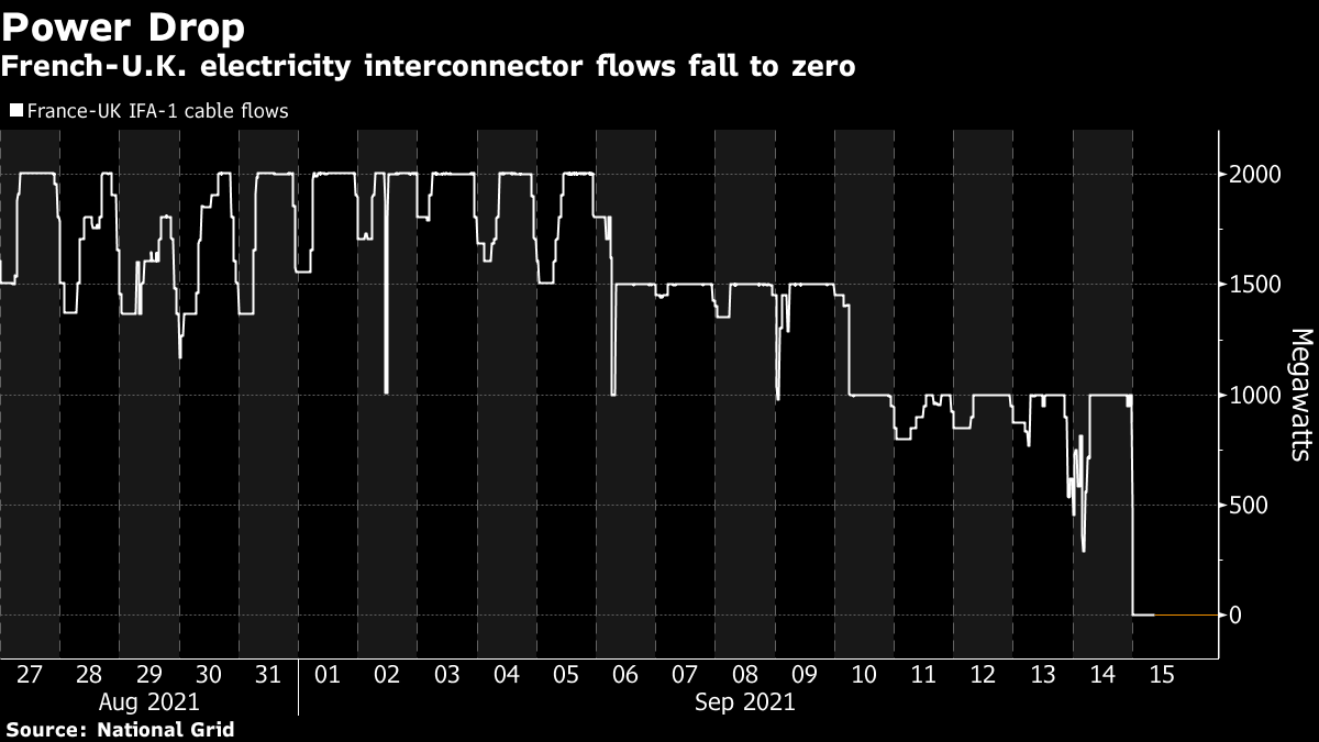 Britain is a net importer of power, with France its biggest supplier via two cables that run across the English Channel. One of those was knocked out by the fire, according to National Grid, and it will be out of action until at least Oct. 13. The lost capacity is the equivalent of about two nuclear power stations.