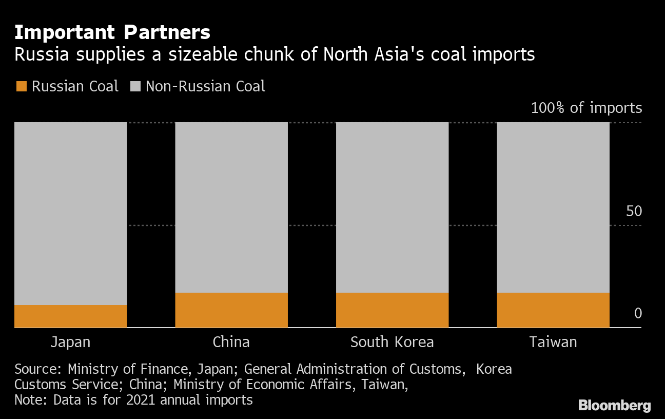 (Bloomberg) -- Coal prices in Asia jumped as Europe’s move to ban Russian imports of the fuel threatened to deliver a new global supply challenge.