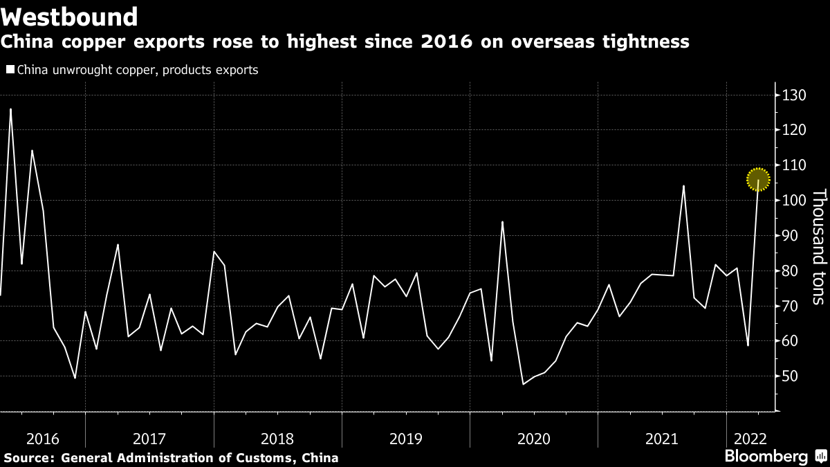 A global supply squeeze following Russia’s invasion of Ukraine has lifted China’s copper exports to the highest since 2016. Usually known as a massive importer of metals, the country sent over 100,000 tons of copper abroad last month, nearly double February’s amount. China’s aluminum exports also surged to a record last quarter as overseas markets tightened due to the war.