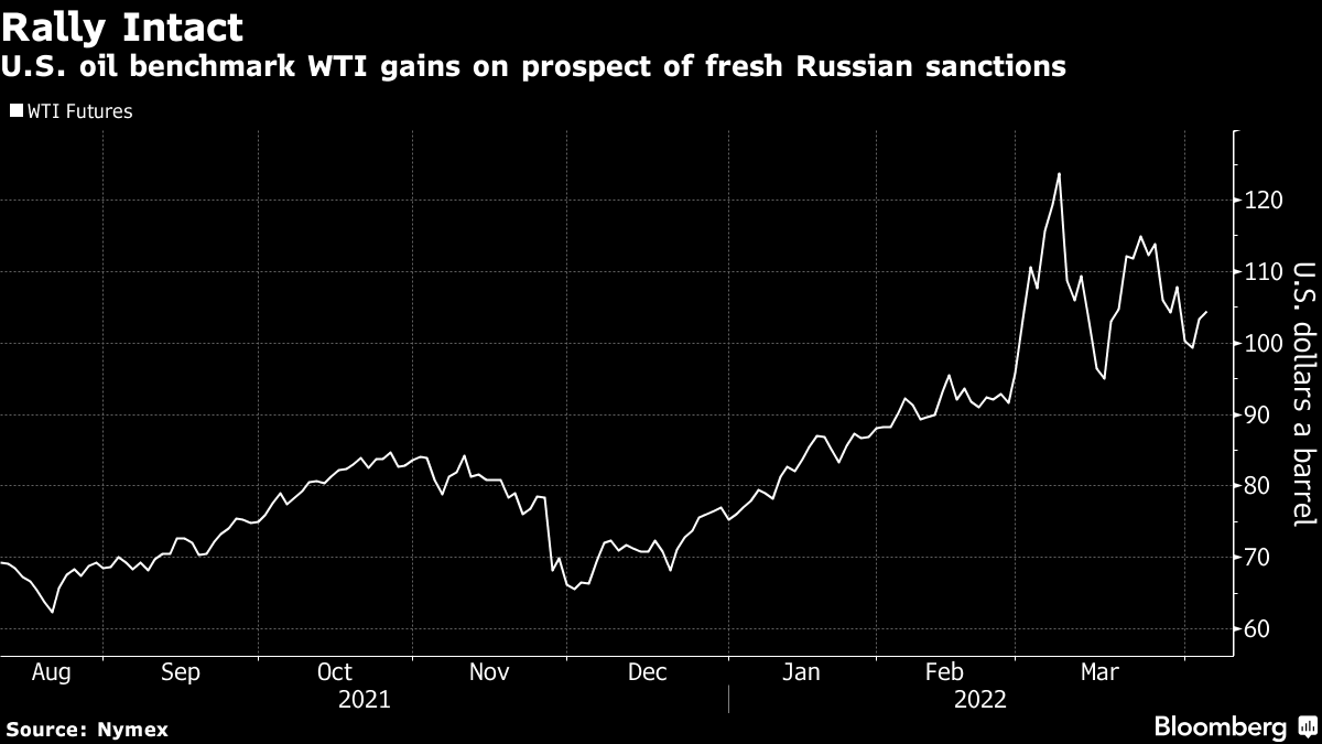 West Texas Intermediate fell below $103 after earlier advancing to above $105 a barrel. European Commission President Ursula Von Der Leyen said Tuesday the group is working on further measures that will include sanctions on oil imports. Germany’s foreign affairs minister said the bloc will exit Russian fossil fuels, starting with coal.
