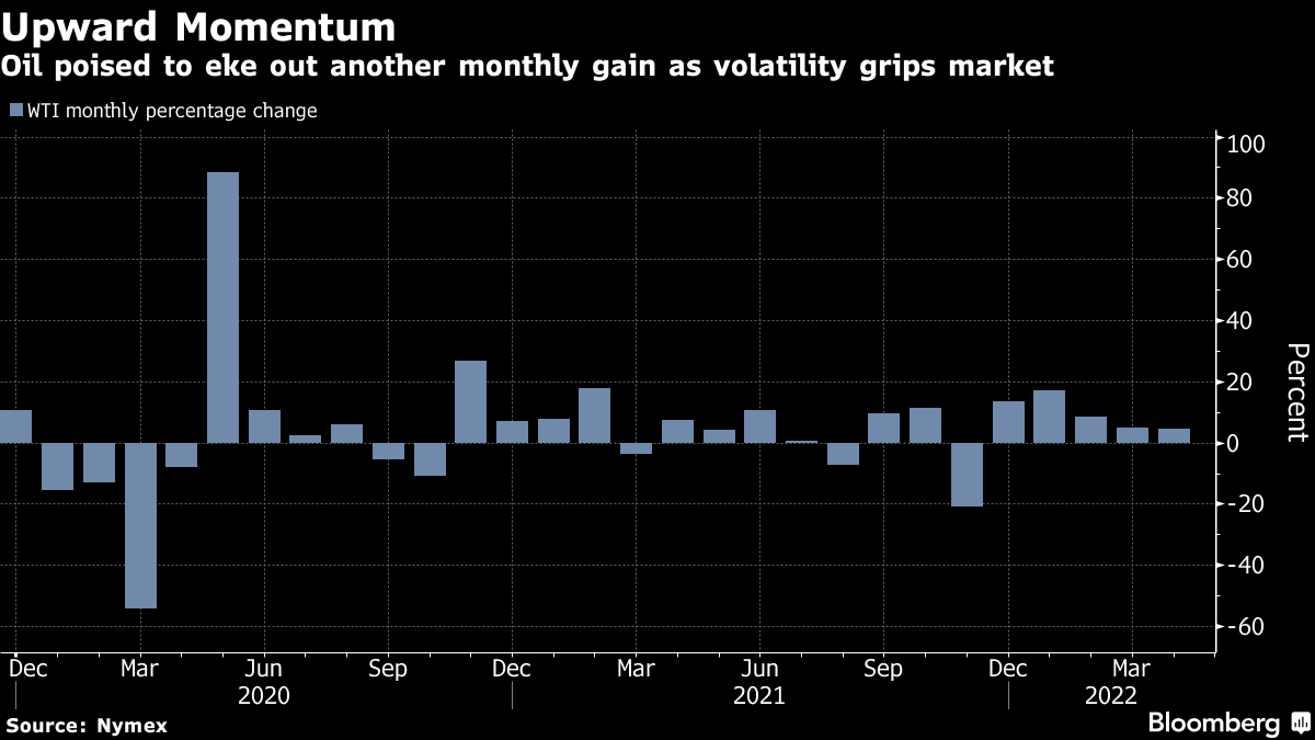 (Bloomberg) -- Oil is poised to eke out a fifth monthly advance after another tumultuous period of trading that saw prices whipsawed by the fallout of Russia’s war in Ukraine and the resurgence of Covid-19 in China.
