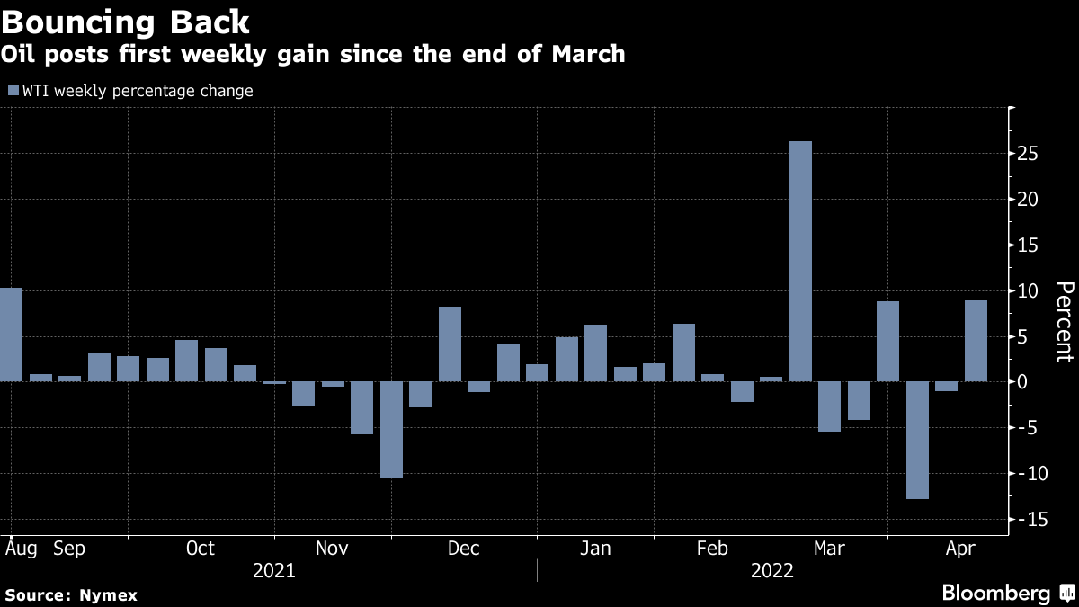 (Bloomberg) -- Oil notched a weekly gain as traders weighed a global supply deficit, a potential ban on Russian oil from the European Union and China’s latest virus lockdowns.