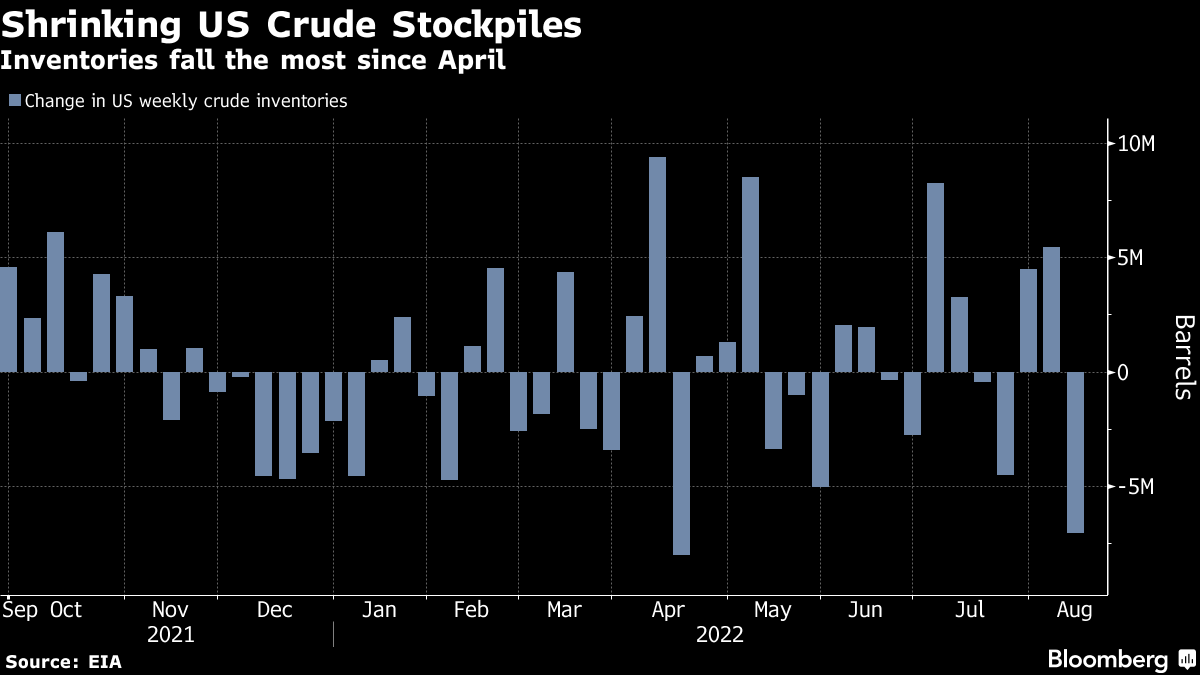 A bullish Energy Information Administration report offset some of the gloom, however. US crude stockpiles sank by 7.06 million barrels last week, exports rose to a record and gasoline demand climbed to the highest this year.
