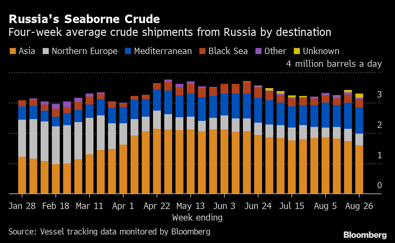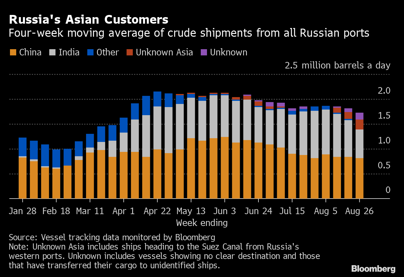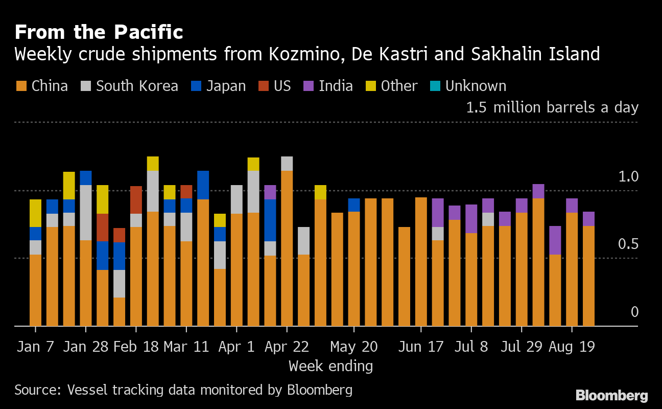 Based on current destinations, the average flow of Russian crude to Asia continued to slide, dropping to 1.59 million barrels a day in the four weeks to Aug. 26, from more than 2.1 million barrels a day in April and May.