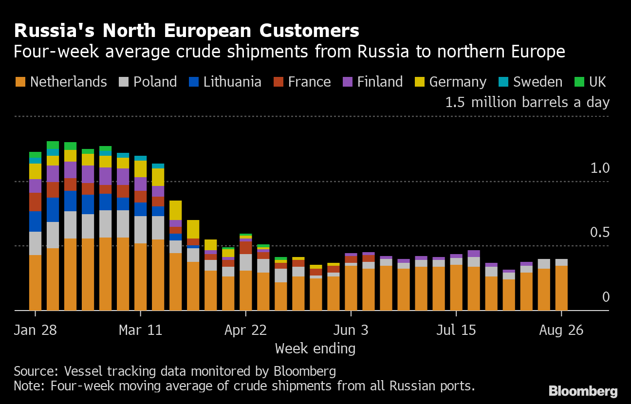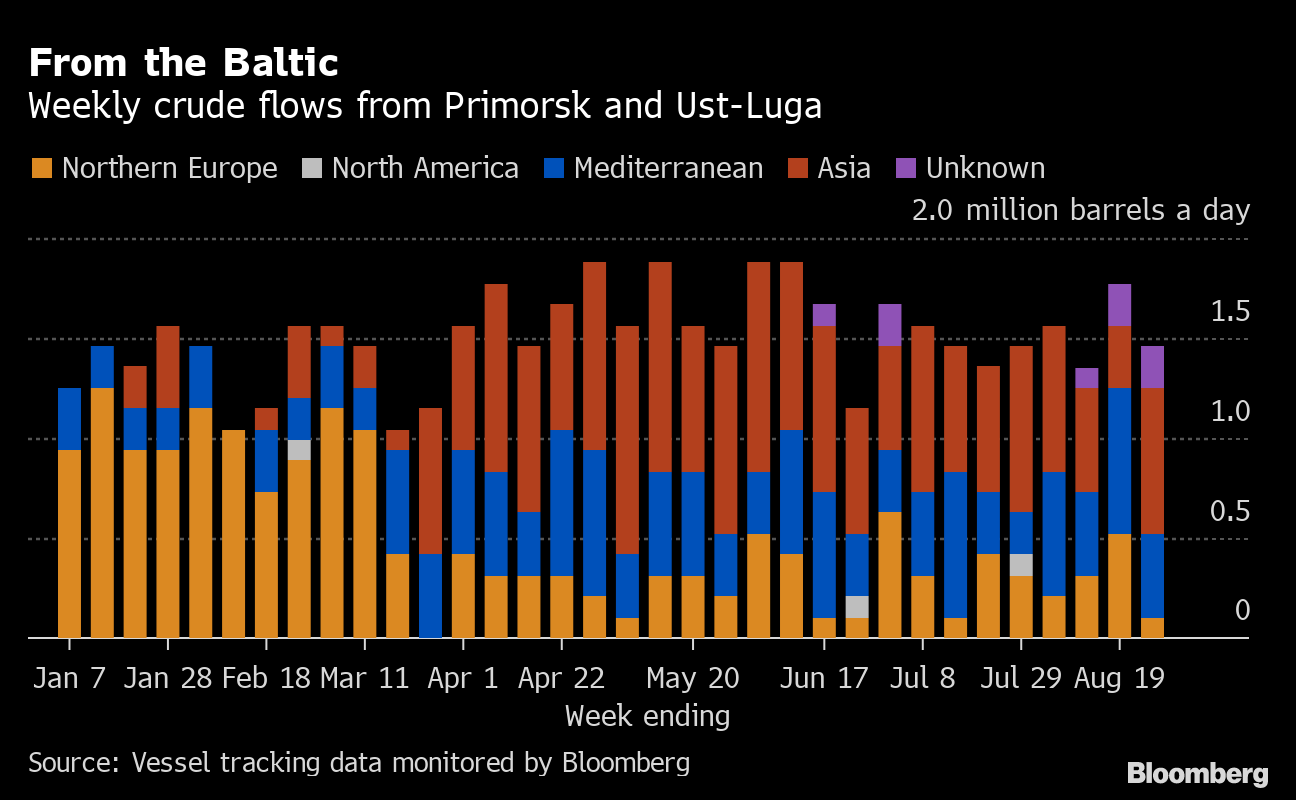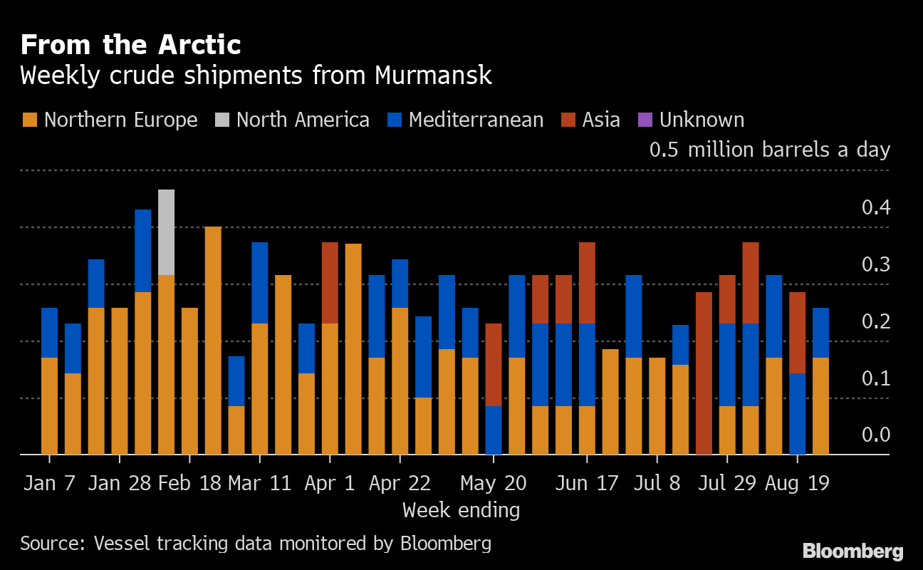 Based on current destinations, the average flow of Russian crude to Asia continued to slide, dropping to 1.59 million barrels a day in the four weeks to Aug. 26, from more than 2.1 million barrels a day in April and May.