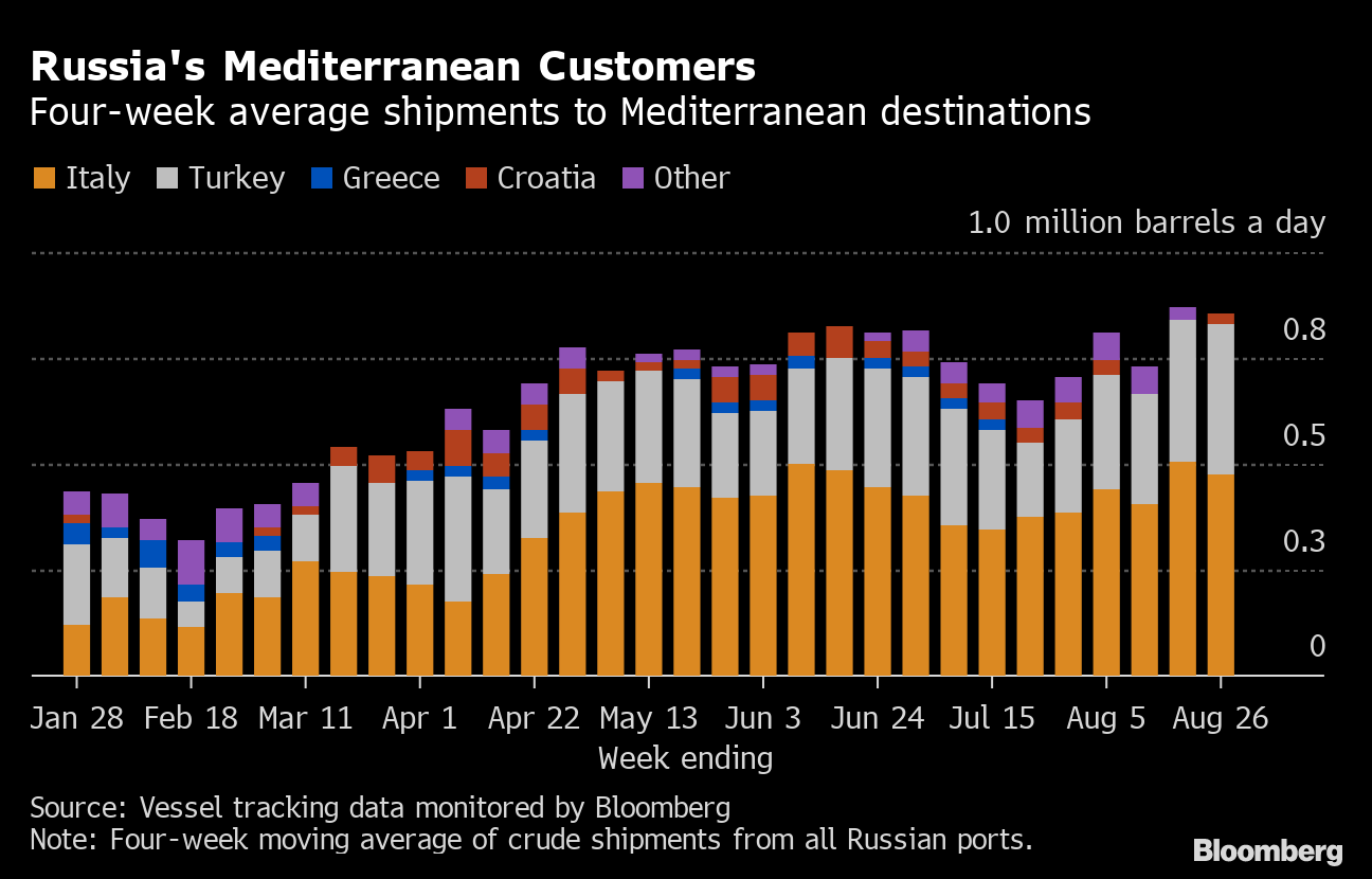 In the west, Turkey has been the lifeline for Russian oil sales into the Mediterranean market, and its role is likely to become even more important when additional European Union sanctions come into effect in December, cutting off buyers in Italy.