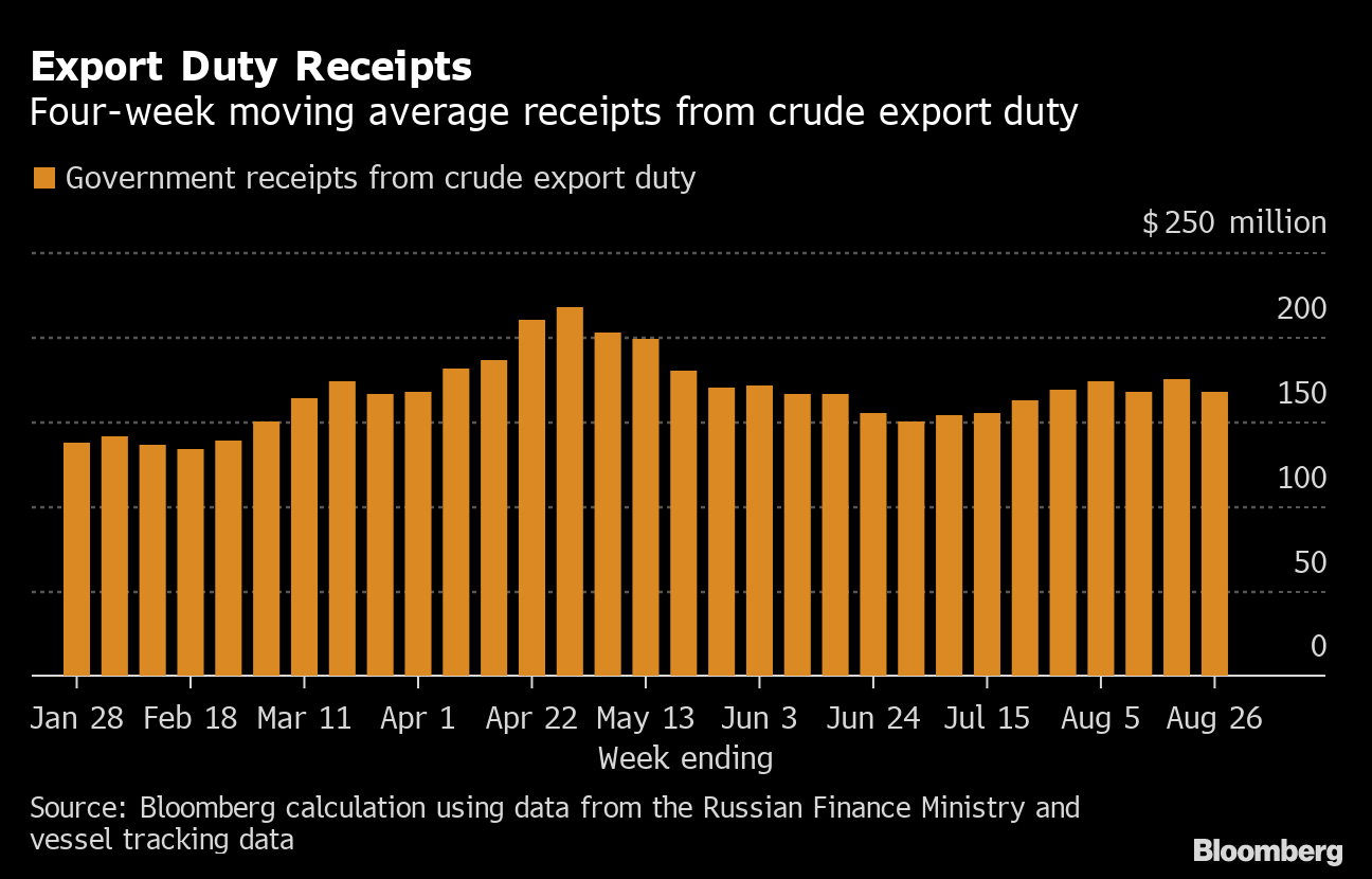 Inflows to the Kremlin's war chest from its crude-export duty remain higher than they were before the war, with average weekly income at $167 million, according to the most recent figures. On a four-week average basis, income slipped to $154 million a week, down from $183 million a week in the period to Aug. 19.
