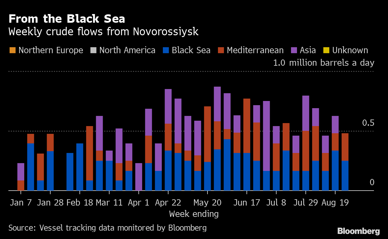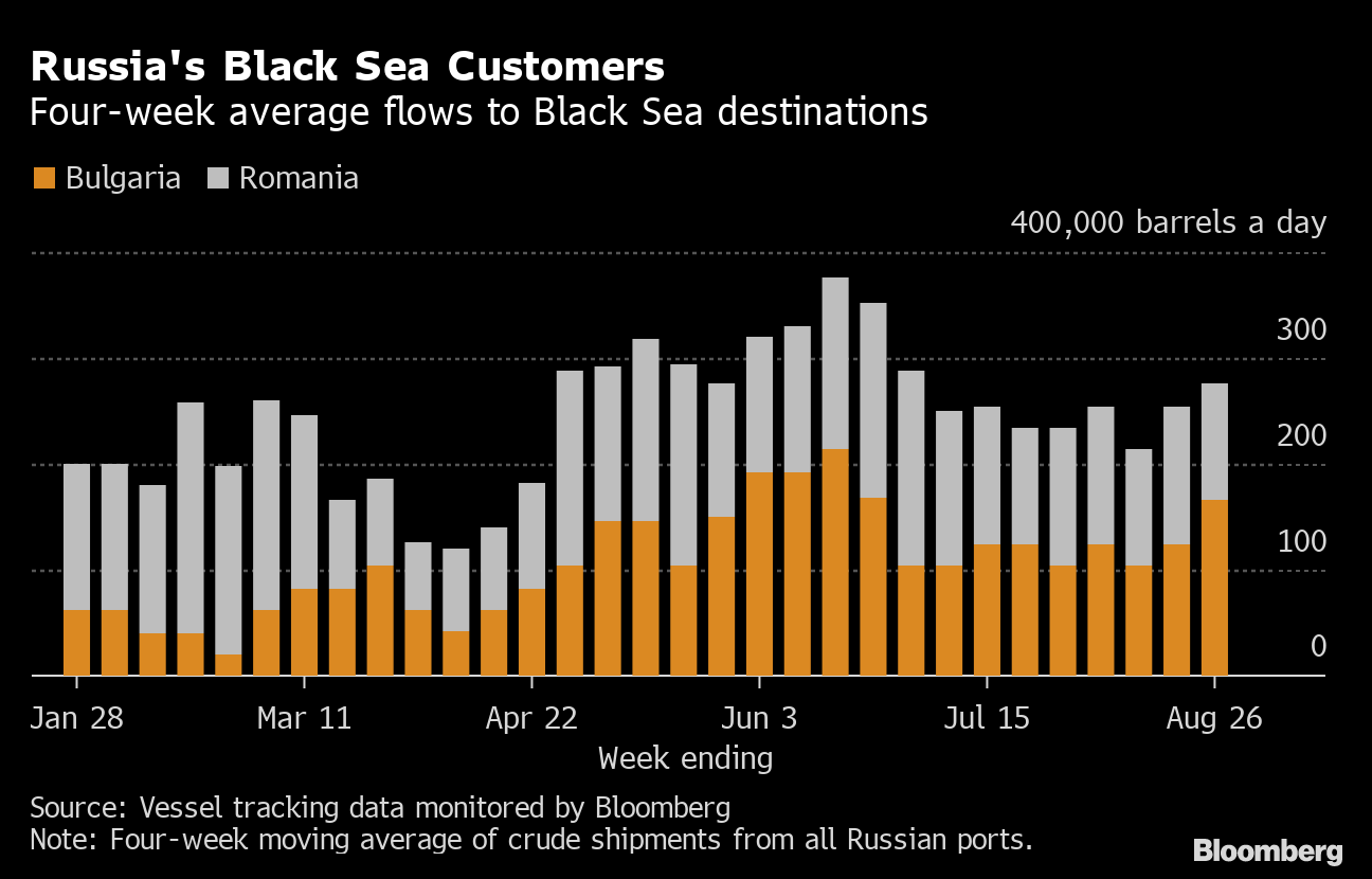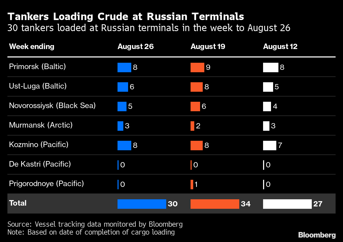 Shipments from Russia in the week to Aug. 26 gave up most of the previous gains on both a weekly and four-week average basis, according to vessel-tracking data monitored by Bloomberg.