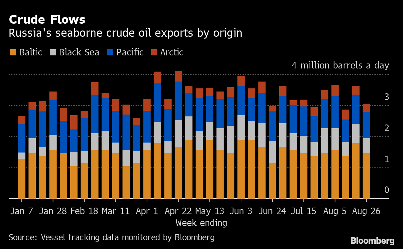 Aggregate crude flows from Russian ports fell by 587,000 barrels a day, or 16%, in the seven days to Aug. 26, compared with the previous week. Flows were lower from all export regions.