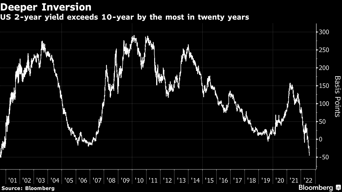 Australian debt pushed higher and Treasuries held an advance. An inversion in the US yield curve highlights expectations that further aggressive Federal Reserve interest-rate hikes could spark a recession. The dollar was steady.