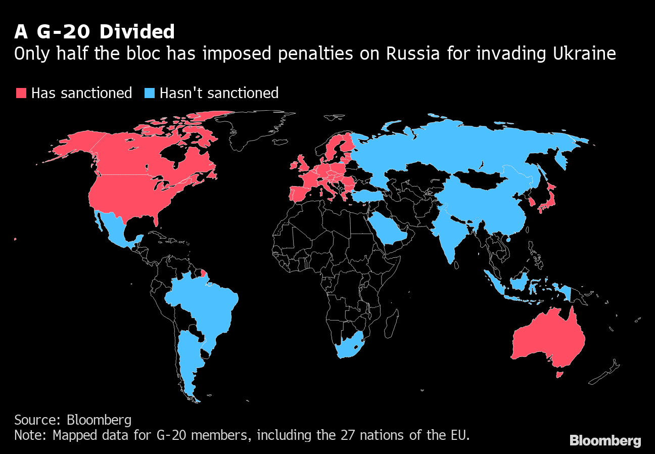 Comprising nations that account for some 85% of global economic output, the G-20 is supposed to be more reflective of the world. Yet only half its number has joined the international sanctions imposed on fellow member Russia over its invasion of Ukraine.