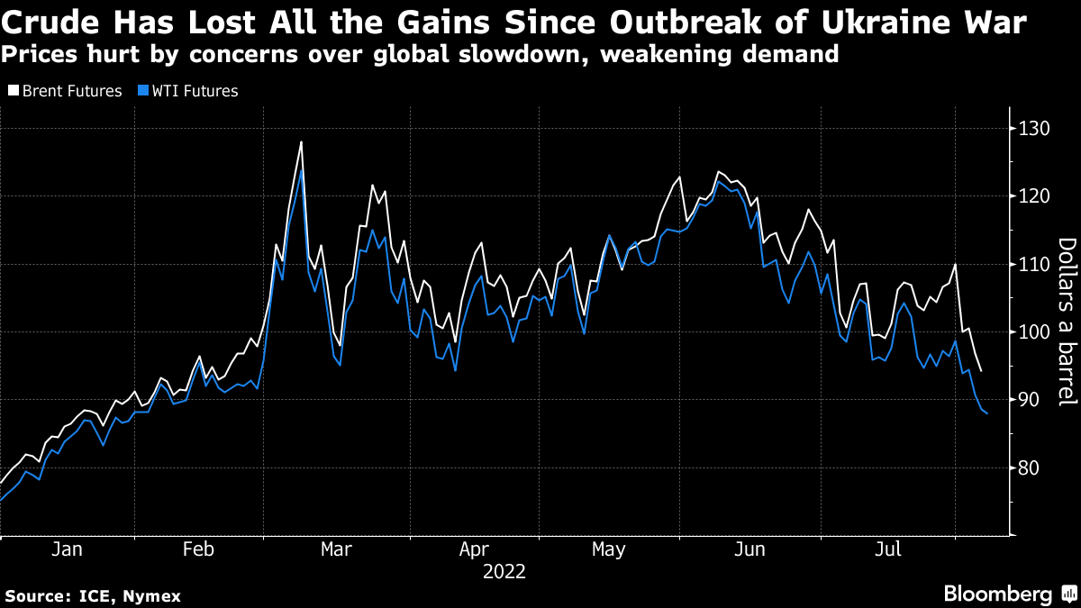 Oil headed for a punishing weekly loss on increasing evidence that a global economic slowdown is spurring demand destruction, with prices collapsing to the lowest level in six months as key time spreads contract.