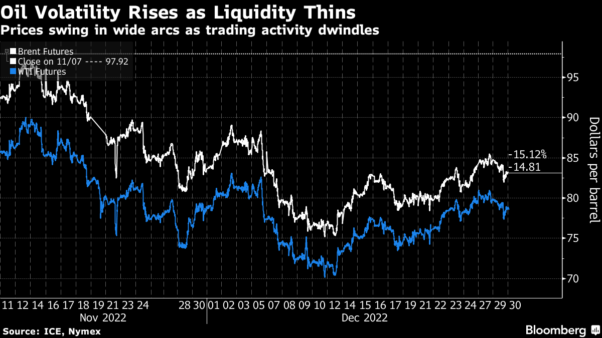 Crude is heading for the first back-to-back quarterly loss since 2019 after a volatile year that saw futures surge following Russia’s invasion of Ukraine before retreating as concerns over a global economic slowdown mounted. A lack of liquidity has exacerbated price swings this year.