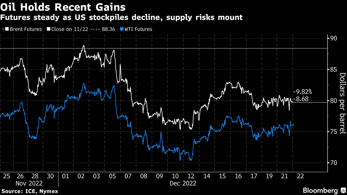West Texas Intermediate for February delivery traded above $76 a barrel after rising more than 2% in the week’s first two sessions amid declining liquidity. The American Petroleum Institute said US crude inventories shrank by 3.1 million barrels last week, according to people familiar with the data.