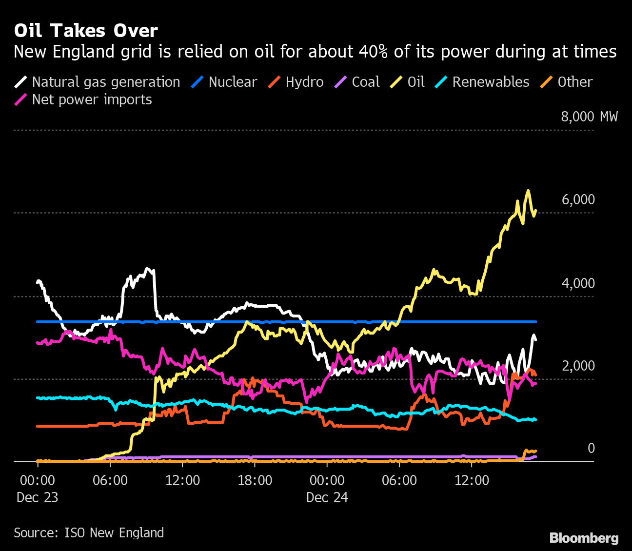 (Bloomberg) -- Oil took over from natural gas as the leading fuel for power plants in New England, a significant switch that signals how the grid is desperately trying to keep the lights on in the face of a winter massive storm.