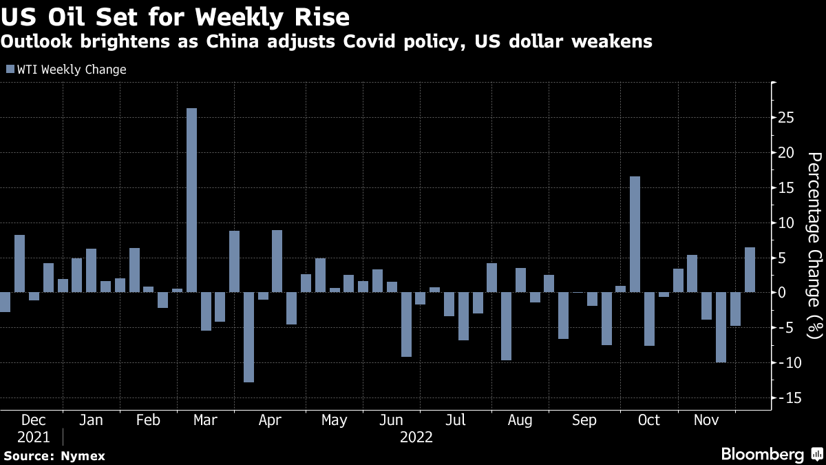 (Bloomberg) -- Oil headed for its biggest weekly advance in almost two months as China took more steps to soften its strict virus controls and Washington mulled a pause in sales from strategic reserves.