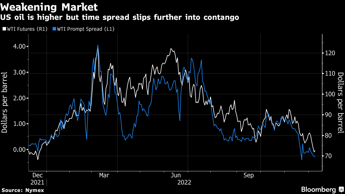 Key time spreads are indicating ample near-term supply. WTI’s prompt spread — the difference between the two nearest contracts — is slipping further into a bearish contango structure. The gap was 26 cents a barrel in contango compared with 91 cents in the opposite backwardated structure a month ago.