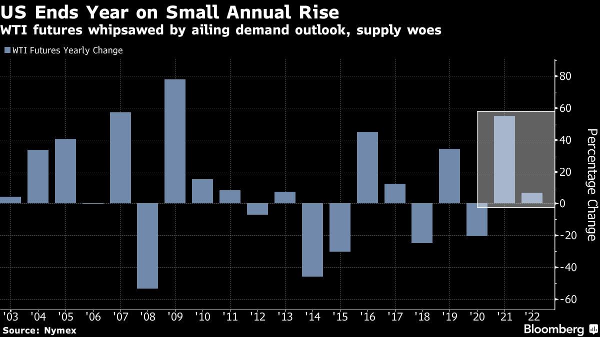 West Texas Intermediate futures staged a last-minute rally in the final session of the year to settle above $80, marking a 4% annual gain. The finish was a far cry from the triple digits seen earlier this year after Russia’s invasion of Ukraine upended global supplies and sent prices soaring.