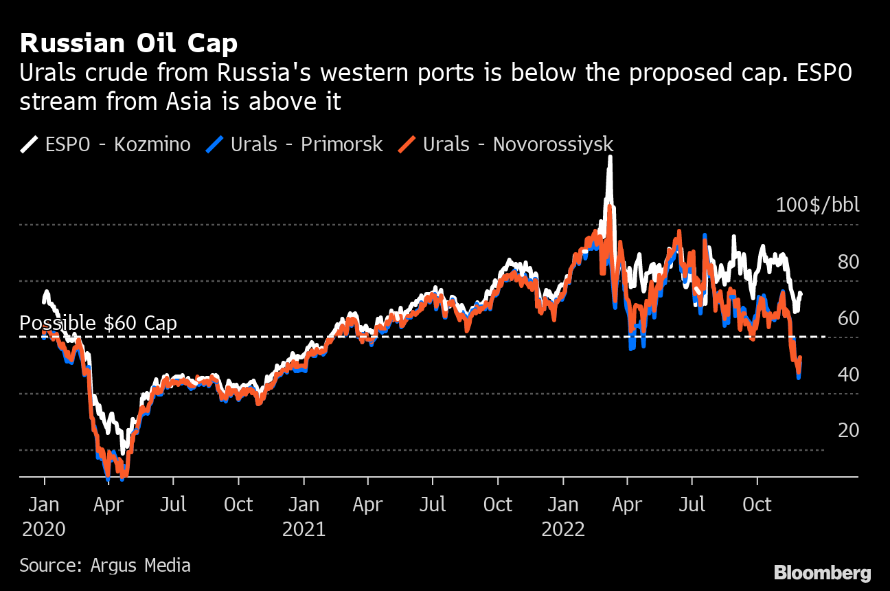 (Bloomberg) -- The Group of Seven is set to impose a price cap on Russian oil that’s well above where it now trades. If there was ever any doubt what the premise of the cap was, it’s now clear: the US and its allies want Russia’s crude to keep flowing.