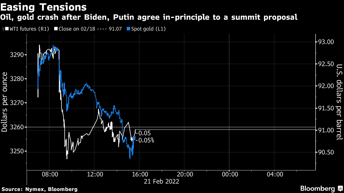 West Texas Intermediate initially fell 2.7%, before recovering most of its slump, after Joe Biden and Vladimir Putin agreed to the “principle” of a summit proposed by French President Emmanuel Macron, according to statements from the White House and the Elysee. The Kremlin gave a cautious response and that there were “no concrete plans” for the talks to take place.