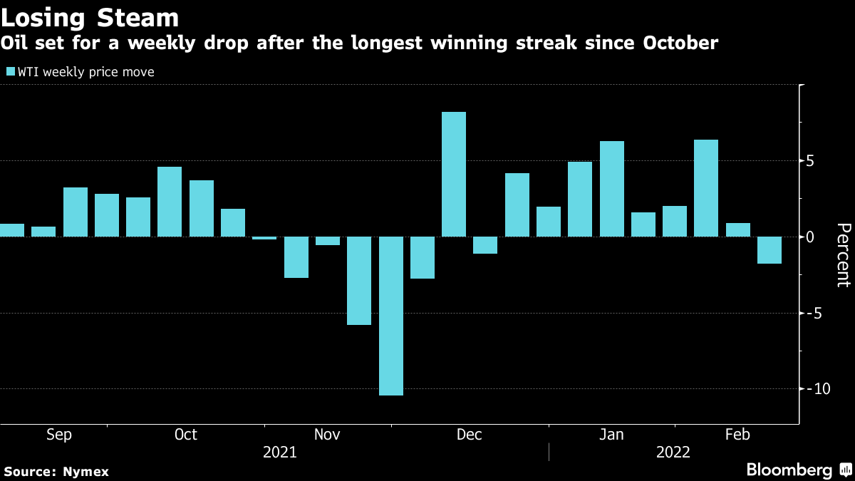 (Bloomberg) -- Oil headed for a weekly loss as investors weighed the crisis over Ukraine and the possibility that Iran’s nuclear deal may be revived.