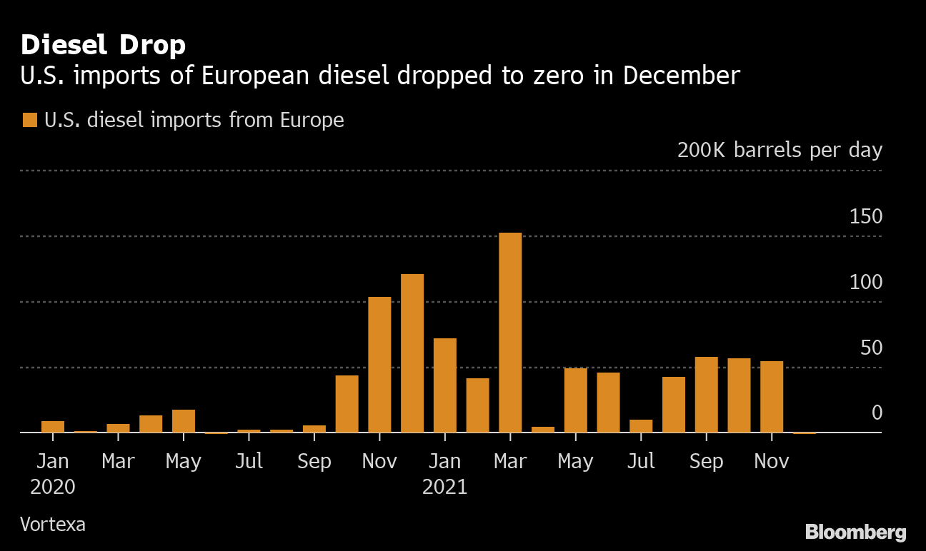 Shipments of European diesel to the U.S. rose in the last quarter of 2020 as American refiners reduced operations following a pandemic-related collapse in demand, data from industry consultant Vortexa Ltd. show. U.S. imports of diesel and gasoil averaged about 53,000 barrels a day through the first eleven months of 2021, then dropped to zero in December -- the first time that’s happened since mid-2020.
