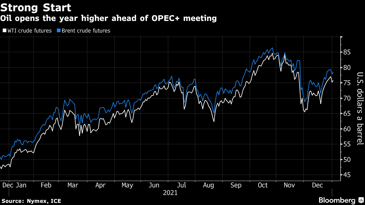 Oil posted its biggest annual gain since 2009 last year as the rollout of vaccines helped economies to reopen, boosting energy demand. While OPEC+ is poised to add another 400,000 barrels a day to global supply, there are still concerns about crude demand as China tackles a Covid-19 flare-up and the omicron virus variant leads to flight cancellations worldwide.