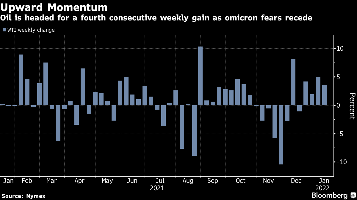 (Bloomberg) -- Oil headed for a fourth straight weekly gain, the longest winning streak since October, on signs that the market is tightening as global consumption withstands the impact of the omicron virus variant.