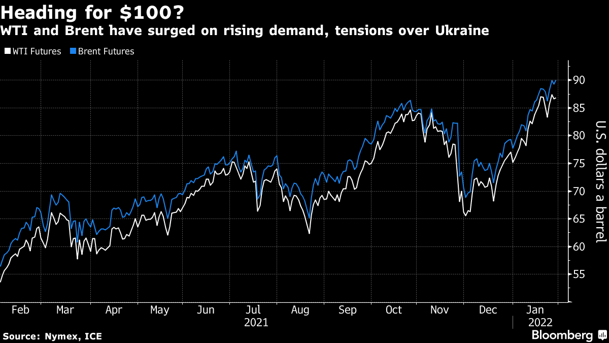 (Bloomberg) -- Oil markets opened the week on the front foot on signs of sustained global demand and continued tensions over Ukraine, putting Brent on course for its best January performance in at least 30 years.