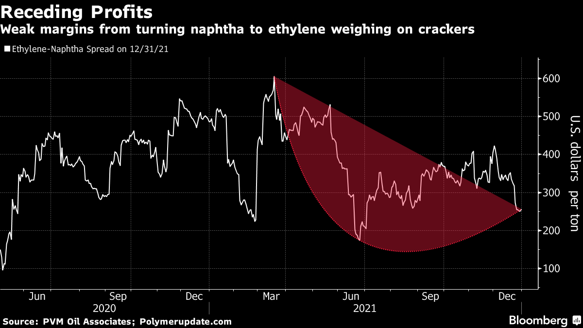 Output has surged, while oil-based naphtha has become more expensive due to increased demand and the rising cost of crude. That's combined to drive profits from converting naphtha to ethylene to the lowest since July. Ethylene cracker operators including Taiwan's Formosa Petrochemical Corp. and South Korea's LG Chem Ltd. responded by trimming processing, said traders and an analyst.
