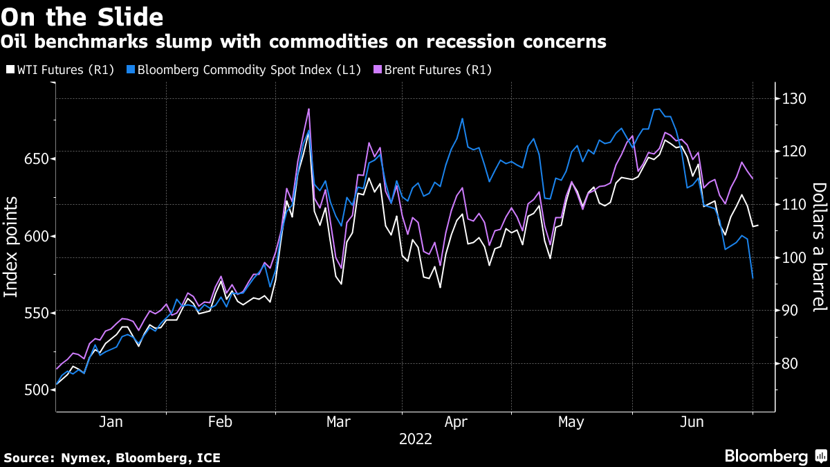 Oil fell about 8% in June as investors fretted over a potential global slowdown, eroding a rally spurred by the war in Ukraine, interruptions to supplies and rising demand. The jump in prices alarmed President Joe Biden, who’s spearheading efforts to get producers in the Middle East to boost crude output.