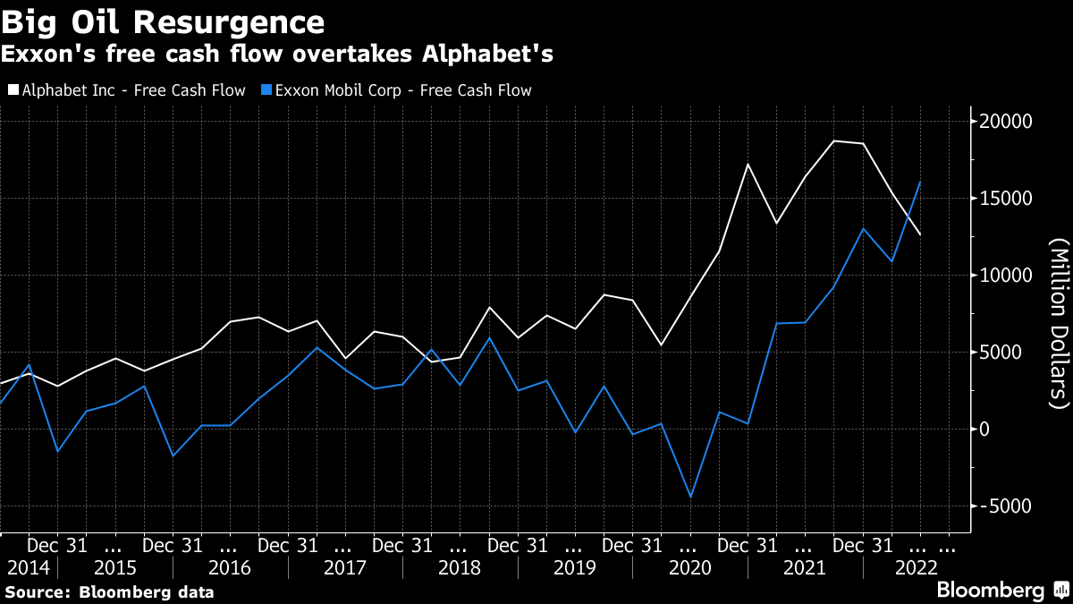 (Bloomberg) -- Exxon Mobil Corp.’s cash haul overtook that of Alphabet Inc. for the first time since 2018, proving the oil giant is back in the big league just a year after suffering one of the biggest activist shareholder upsets in corporate history.