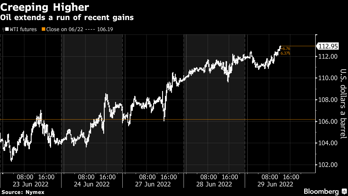 West Texas Intermediate rose as much as 2.4% to trade near $114 a barrel. US crude stockpiles fell 2.76 million barrels last week, according to an Energy Information Administration report Wednesday. Inventories at Cushing, Oklahoma, the largest storage hub in the US, fell to the lowest since October 2014. Data for two weeks was released simultaneously after an outage last week.
