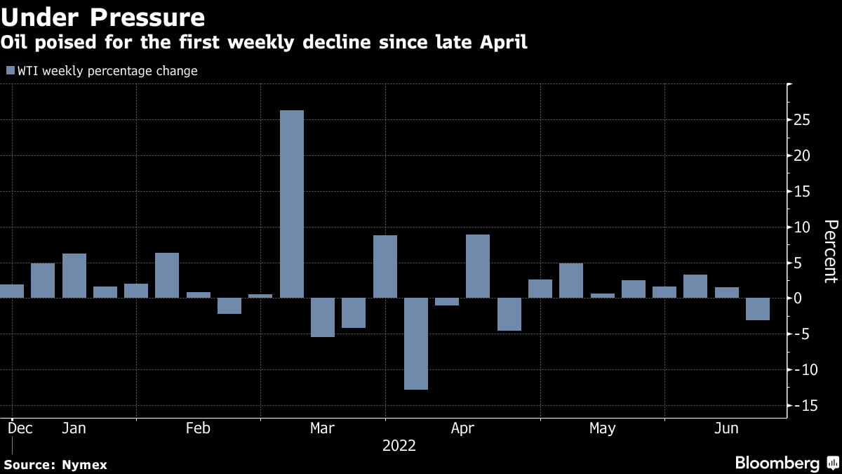 (Bloomberg) -- Oil is heading for the first weekly decline since April after a period of choppy trading as investors weigh the prospect of further monetary tightening from central banks to curb rampant inflation.