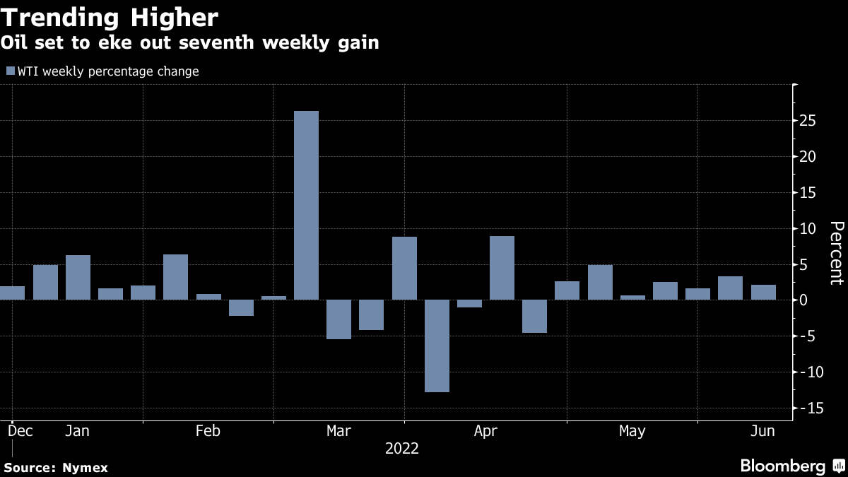 Oil has maintained its upward momentum this year through bouts of volatile trading after Russia’s invasion of Ukraine in late February. Goldman Sachs Group Inc. this week boosted its price forecasts into 2023, while OPEC warned that most members are “maxed out” on crude production. The European Union is also working toward a ban of Russian crude imports to member states.