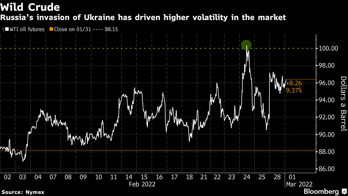 Futures in New York rose almost 1% in Asia after advancing 4.5% on Monday as sanctions on Russia rippled through the market. A release of 60 million barrels is being considered by the U.S. and others, according to people familiar, which would be equivalent to less than six days of Russian output. The International Energy Agency, meanwhile, will hold an extraordinary ministerial meeting on Tuesday, Executive Director Fatih Birol said on Twitter.