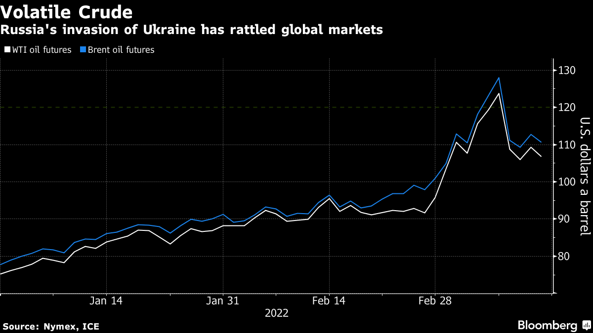 Futures in New York fell more than 2% to trade below $107 a barrel after rising Friday. The war in Ukraine has roiled commodity markets from crude to grains, leading to buyers shunning Russian oil as they navigate sanctions, though some are considering workarounds. Senior American and Chinese officials meet Monday as the U.S. seeks to enlist China to help end the invasion.