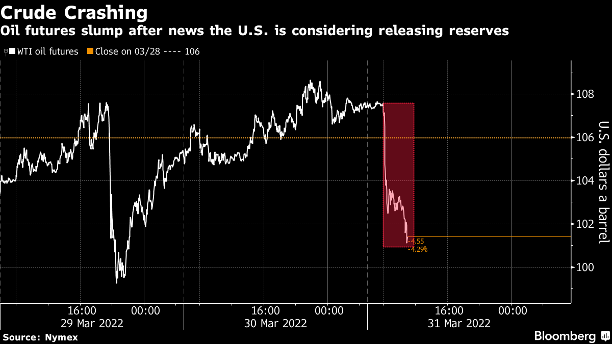 (Bloomberg) -- Oil tumbled on signs the Biden administration is considering tapping U.S. reserves again in a potentially massive release to tackle rising inflation and supply shortages following Russia’s invasion of Ukraine.