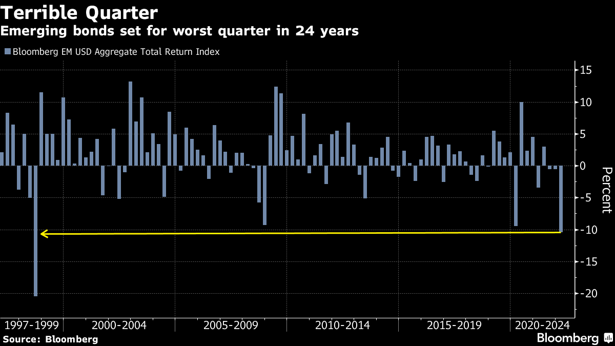 The war has sparked a bout of risk aversion, putting a Bloomberg gauge of emerging dollar debt on course for its worst quarter since the 1998 Asian financial crisis. Stocks are just shy of their biggest quarterly slide since the pandemic began, while three-quarters of the emerging currencies tracked by Bloomberg are down.