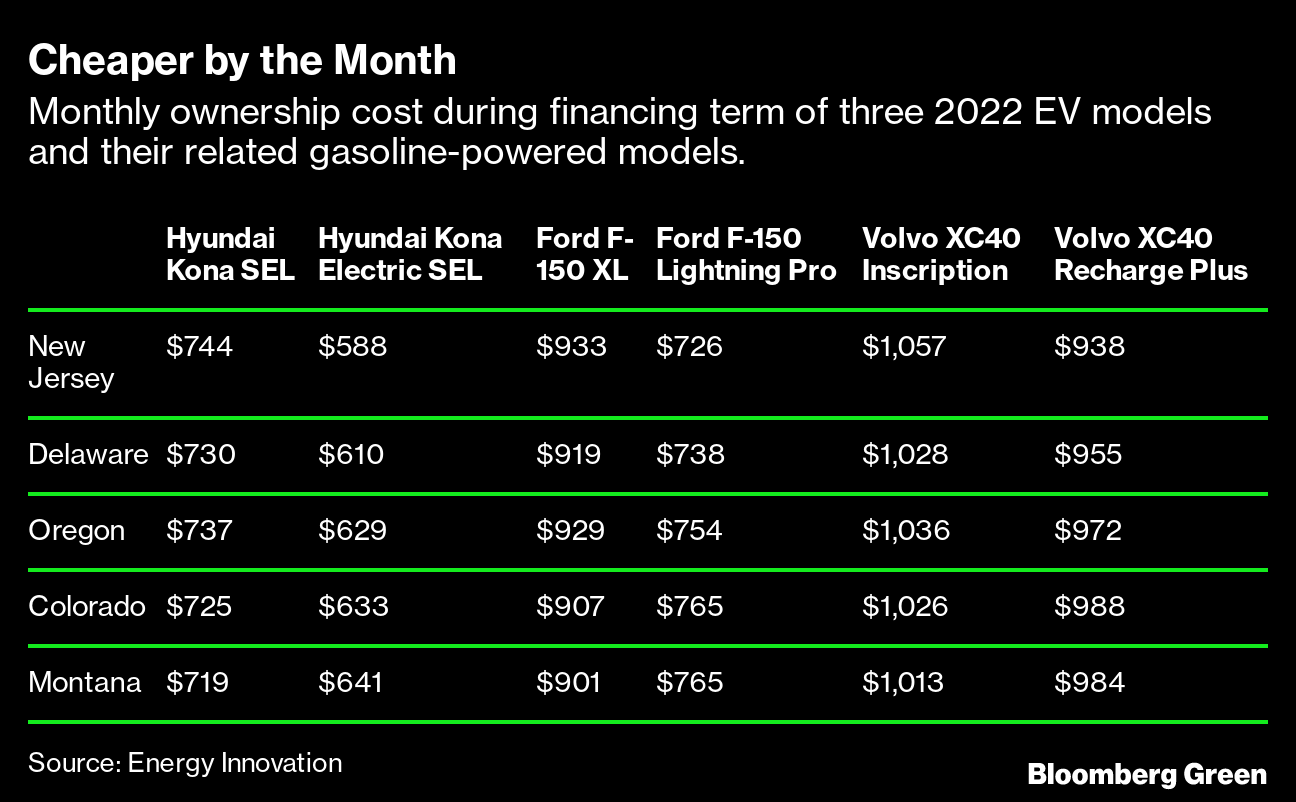 Six EV models were studied, alongside related gas versions: the Volvo XC40 ($56,395 MSRP), the Nissan Leaf ($28,425 MSRP; compared to the Nissan Versa), the Kia Niro EV EX Premium ($45,865 MSRP), the Hyundai Kona Limited ($43,745 MSRP), the Hyundai Kona SEL ($35,245 MSRP) and the Ford F-150 Lightning ($41,669). The goal, Orvis says, was to get a fairly representative group of different size classes; and, as best they could, to “really have an apples to apples comparison.” (The top 5 states with the lowest costs for three of the six models studied are shown on the chart above.)