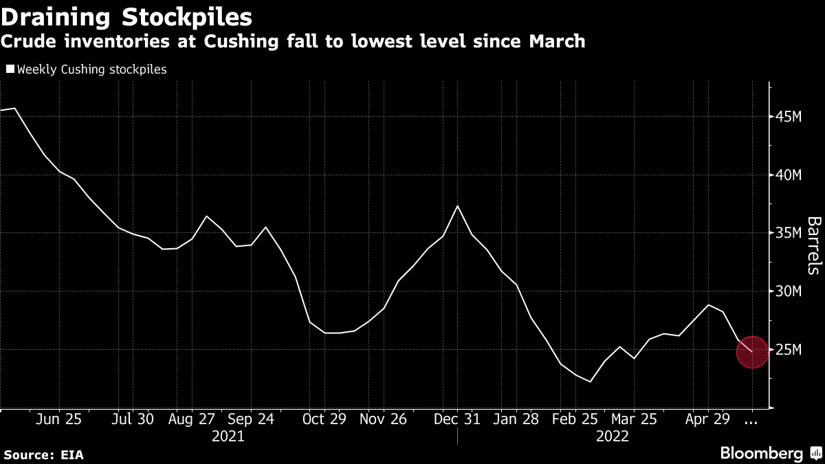 West Texas Intermediate futures rose more than 3% alongside a rebounding equity market, while the dollar fell, which makes commodities priced in the currency cheaper. Global crude markets continue to tighten due to a combination of rebounding demand and disrupted Russian supplies. US gasoline stockpiles declined to the lowest seasonal level since 2014, according to government data on Wednesday.
